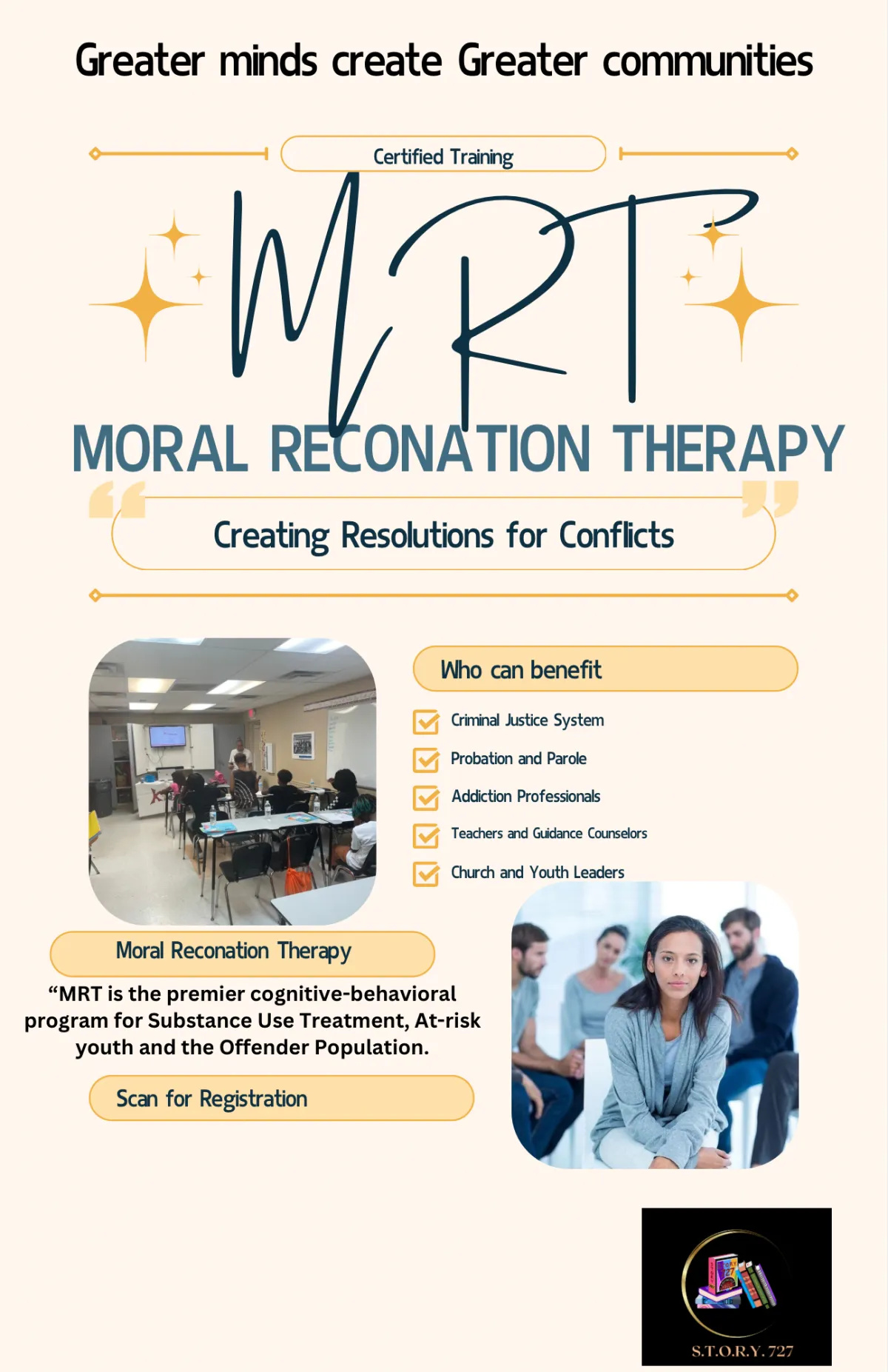 At S.T.O.R.Y 727, we believe that true financial and leadership success can only come from addressing the deeper emotional issues that can hold us back. Our innovative approach to financial coaching, leadership development, conflict resolution and moral reconation therapy is based on the idea that everyone has a powerful story to tell. Through our personalized sessions, we listen to each individual's unique story and work with them to break down the barriers that are preventing them from reaching their full potential. If you’re ready to move from bars to stars, contact us today.